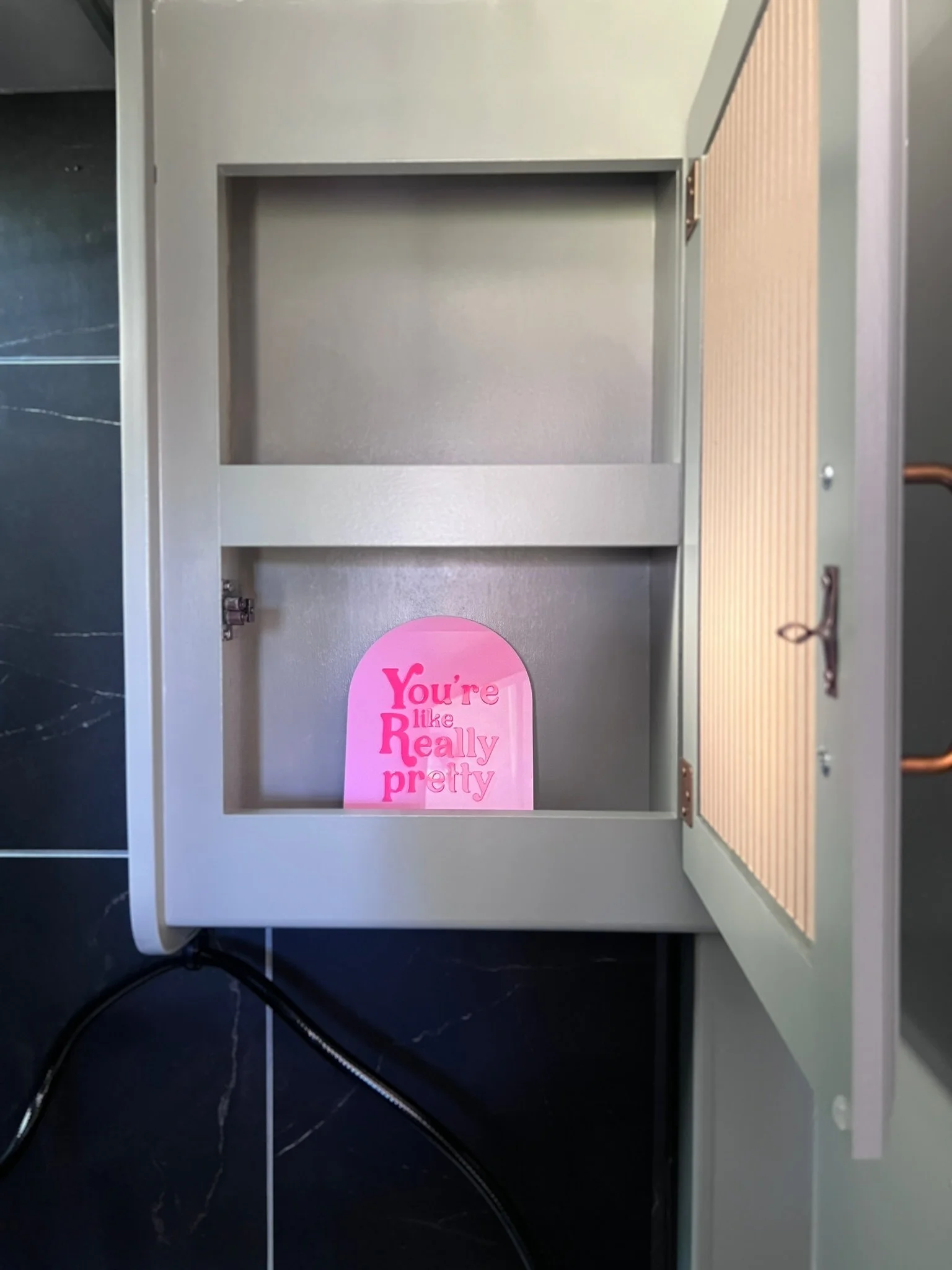 Custom pin board installed on the bathroom door for hanging personal things like photos, to-do lists, recipes, or art!